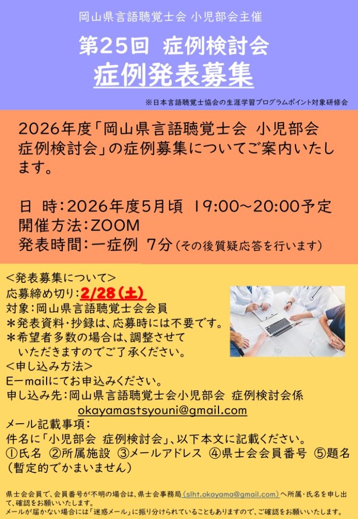 岡山県言語聴覚士会小児部会主催第25回症例検討会【R8.5月オンライン開催予定】